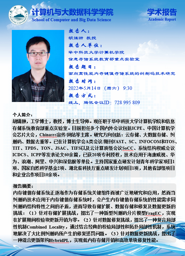 胡橘翀,工学博士,教授,博士生导师。现任职于华中科技大学计算机学院和信息存储系统教育部重点实验室。目前担任多个国内外会议包括ICPE、中国计算机学会芯片大会, Chinasys宣传/网站等主席。研究方向包括:云存储、大数据存储、纠删码、数据去重等。已在计算机学会A类会议/期刊FAST、SC、INFOCOM和TOS、TIT、TPDS、TON、JSAC、TIFS以及云计算顶级会议SoCC、系统结构权威会议ICDCS、ICPP等发表论文60余篇,已获20项专利授权,技术应用于海康威视、华为、浪潮、阿里、中兴和深信服等单位。主持国家重点研发计划青年科学家项目1项、国家自然科学基金2项、湖北省科技厅重点研发计划项目1项,其他省部级项目和企业合作项目10余项。