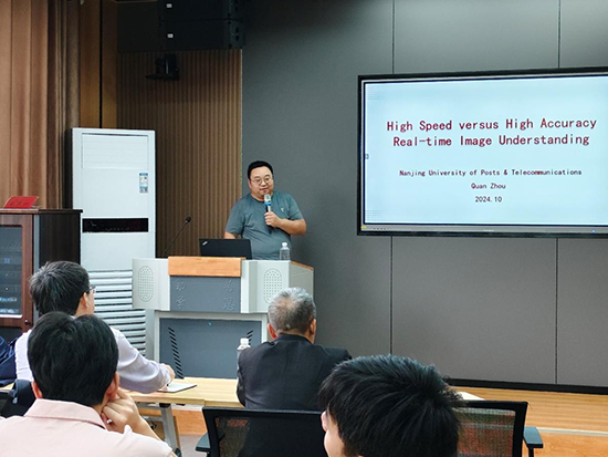 周全教授首先从无人驾驶、行人检测、智慧交通、智慧农业、AI诊疗等实际生活应用场景开篇,简要介绍了当前人工智能技术的发展以及计算机视觉技术在AI领域的重要作用,随后,提出了实际的应用场景遇到的实时图像语义理解中高速度与高精度的问题,以及如何平衡模型性能、轻量化、以及鲁棒性的问题,引入报告主题。接着,周全教授图文并茂的分享了本团队研究成果“Boundary-guided Lightweight Semantic Segmentation”和“Dual-path Network for Real-time Object Detection”,详细介绍了该方案的模型构建过程、内部模块构造方法以及实验效果,从模型轻量化的角度,很好地解决了现实场景中实时图像语义理解的高速度与高精度的问题。在自由交流环节,周教授耐心解答了师生在跨模态检索、数据标注、雨雾天气目标检测以及深度学习模型轻量化部署方面存在的问题,并与师生进行了深入的讨论。