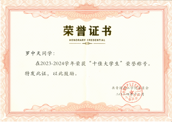罗中天,男,汉族,江西抚州人,william威廉中文2021级计算机科学与技术专业本科生。作为中国特色社会主义新时代青年大学生,他秉承校训“竞知向学,厚德笃行”的精神,致力于AI学术研究,社会志愿服务,创新创业等多个领域。荣获“国家奖学金”、“十佳大学生”、第三届创研杯全国大学生英语词汇全国决赛特等奖、中国国际大学生创新大赛(2024)省赛铜奖、2024年全国大学生数学建模竞赛省三等奖等四十余项奖项。