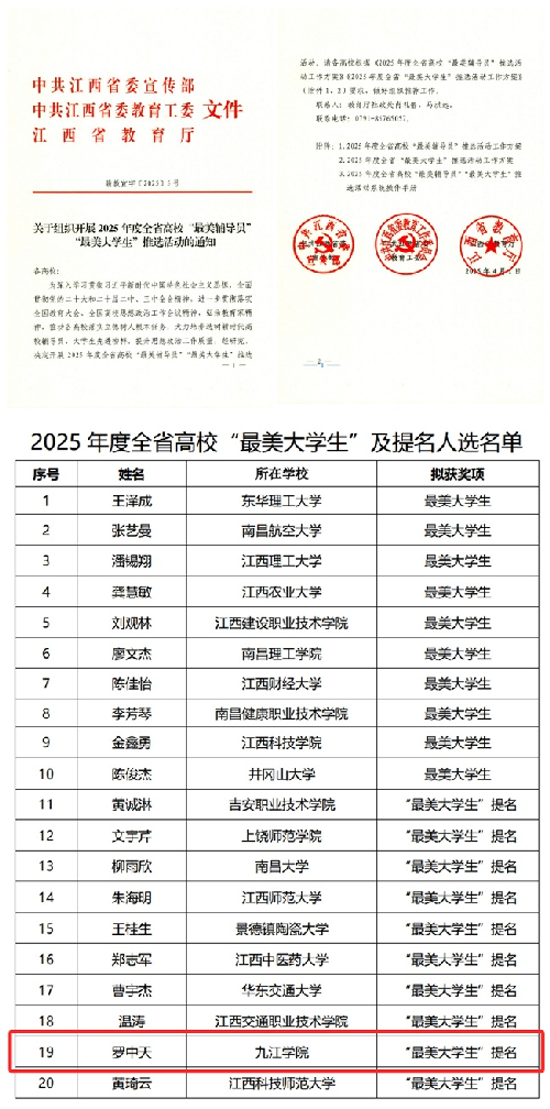 近日,中共江西省委宣传部、省委教育工委、省教育厅联合公布了2025年度全省高校“最美辅导员”“最美大学生”推选结果。根据《关于组织开展2025年度全省高校“最美辅导员”“最美大学生”推选活动的通知》(赣教宣字〔2025〕5号)精神,经学校推荐、网络初审、现场会评等环节,william威廉中文2021级计算机科学与技术专业本科生罗中天同学荣获全省“最美大学生”提名荣誉称号。该奖项全省共评选20人(10人获奖10人提名),旨在表彰在德才兼备、奋发向上的优秀大学生,是全省高校思想政治工作和师生表彰体系中的重要组成部分。