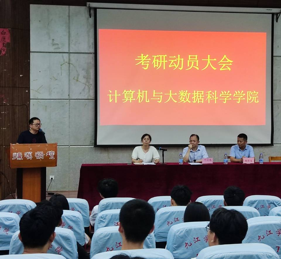 为激发同学们的考研热情,加深对考研形势的认识,加强学院学风建设,6月16日晚七点,计算机学院在文友楼一楼报告厅举办了考研动员大会。本次大会邀请了南昌航空大学软件学院教师杨丰玉,计算机学院院长邓安远、学生科副科长刘欣、教师代表徐利亚、18级全体班主任、辅导员及有考研意向的同学参加本次大会,会议由刘欣主持。