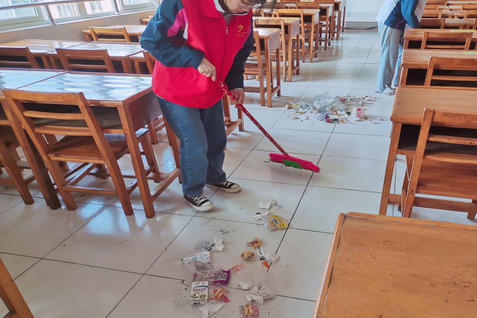 早上九点,志愿者们准时到达文友楼前集合,穿好马甲或校服,戴好小红帽,按照小组名单去到各自负责的教室,开始了清扫工作。志愿者们有的清理桌洞的垃圾,有的抹桌子,有的清理桌上或黑板上的小广告……虽是初夏,天气却已十分炎热,每个人脸上都沁满了细密的汗珠,却也从未停下手中的工作。在大家的分工合作下,每个教室都被打扫的焕然一新,窗明几净的环境让大家都充满了成就感。