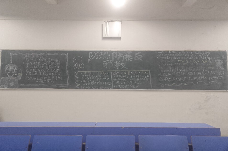 反恐防暴反邪主题黑板报。同时为了能让大家的印象深刻,提升国家安全相关知识的了解程度,在黑板报上出了一期反恐防暴反邪主题黑板报,将防恐防爆及反邪意识内化到每一位同学心中。