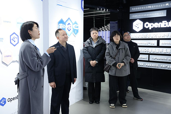 随后,邓院长一行先后来到麒麟信安及欧拉生态创新中心展厅,实时了解中心产业赋能情况,探讨双方在产教融合领域的合作与交流。